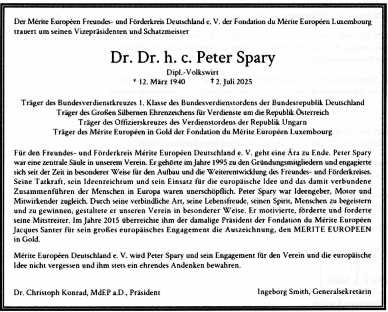 „Ein lieber Mensch hat uns verlassen, ein großer Kämpfer für Europa ist von uns gegangen.“ Dies waren die Worte, die ME-Generalsekretärin Ingeborg Smith im Namen der Mérite Européen Deutschland gewählt hat. Mehr dazu finden Sie in dem angehängten Dokument..